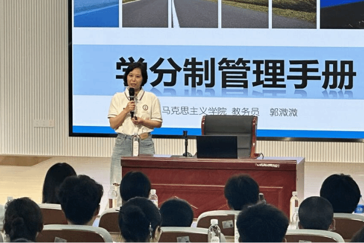 解读学分管理,锚定未来航向。9月15日早上,教务员郭溦溦老师于东门梯教面向2025级全体新生,开展《学分制管理手册》专题解读讲座,助力我院新生快速适应大学学业管理模式。她以“什么是学分制”为起点,用通俗的语言拆解大学学习的运行机制,帮助新生清晰掌握“如何修满学分”“如何选好课程”的核心要点。
