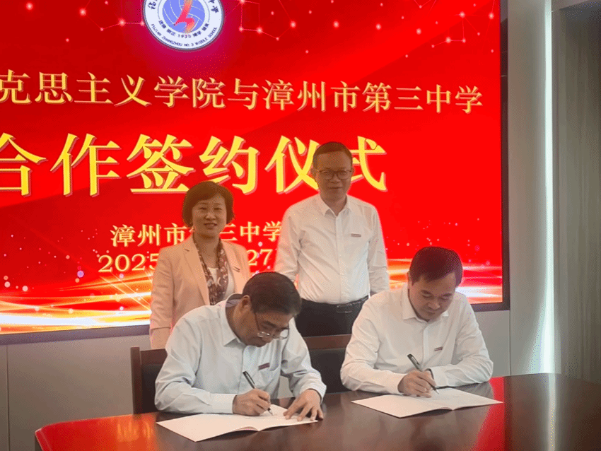 随后,陈再生院长与黄志勇校长共同签署合作协议。校长黄志勇表示,漳州三中致力于践行习近平总书记关于教育的重要论述,希望通过以此次合作,将学校实践层面的教育经验转化为理论成果,进一步拓展课程维度、提升教育质量。陈再生院长围绕合作目标,提出了师生送教进课堂,教育资源互补,打造优质思政课程;共创教研团队,培育优质教学成果等合作举措,提升合作成效。