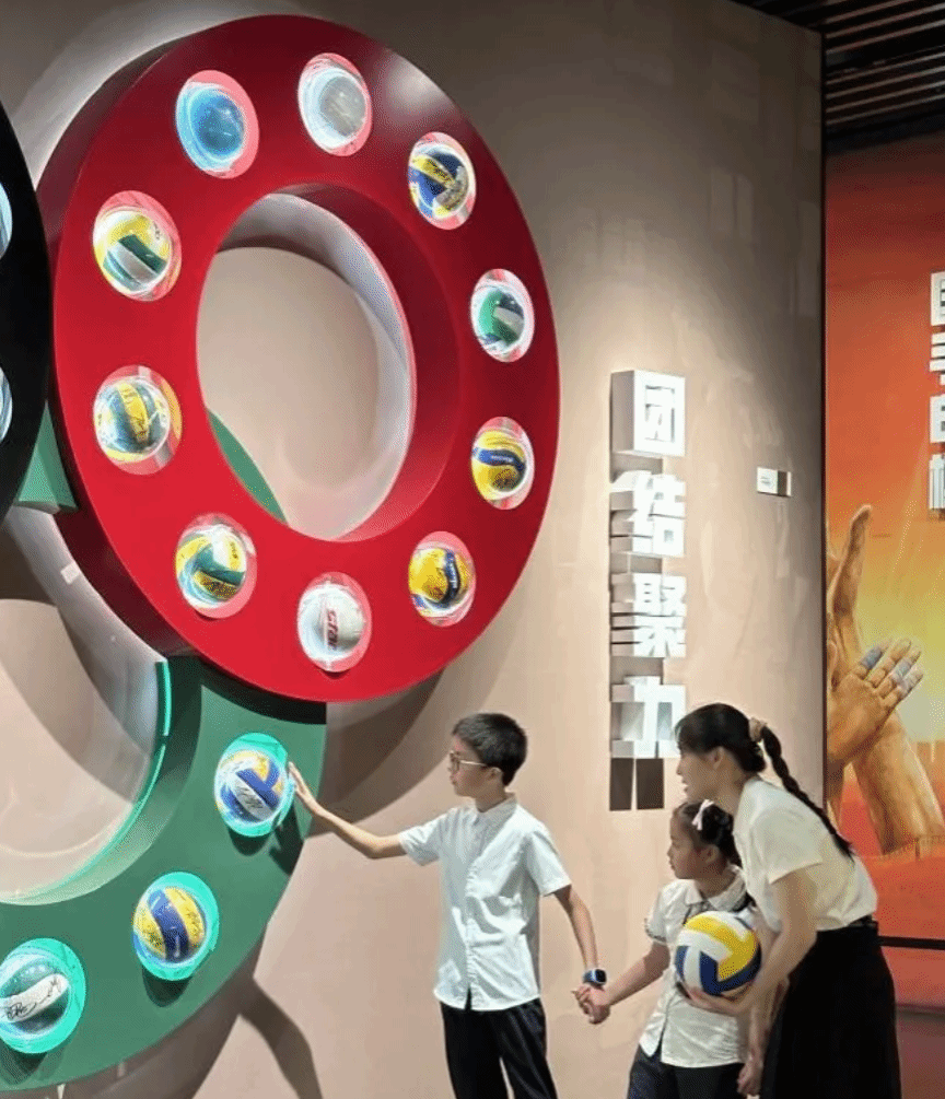 习近平总书记强调:“体育强则中国强,国运兴则体育兴”,排球作为一项体育运动,是增强人民体质,促进身心健康发展的重要方式,而中国女排更是我们家喻户晓的一支队伍。女排精神展示馆“冠军摇篮展厅”前,实践团成员汪相汝牵着惠民社区丞汐、丞渊兄妹的手,将中国女排的故事娓娓道来,通过生动语言讲述着女排队员们“祖国至上、团结协作、顽强拼搏、永不言败”的精神面貌,在场的社区少年们不仅从感悟女排精神过程中深刻感受到中华人民共和国成立75周年来取得的伟大成就,更在心中种下了女排精神的种子。