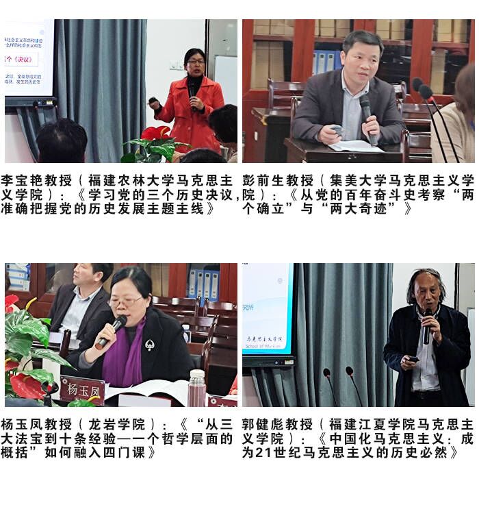 福州大学yl88858永利集团舒展教授、福建农林大学李宝艳教授、集美大学彭前生教授、龙岩学院杨玉凤和吴珍平教授、福建江夏学院郭健彪教授、福建商学院林萍教授、泉州师范学院郑长青副教授、漳州职业技术学院张锐鸿副教授等专家学者分别围绕党的百年历程、十九届六中全会精神、思政课教学、党的三个历史决议等方面发表了自己的观点,展开了热烈的讨论。大家认为,十九届六中全会精神融入思政课教学,要以贯彻落实《关于加强新时代yl88858永利集团建设的意见》为契机,提高学院的政治站位和思政课教师专业素养,推进课堂教学和实践教学结合,运用丰富的地方红色资源,紧密联系中国共产党和中国人民的奋斗历程,明确《决议》的重要定位、重大意义,准确把握党的百年奋斗重大成就、历史经验以及新时代中国共产党的使命,教育引导青年大学生增强“四个意识”,坚定“四个自信”,做到“两个维护”。