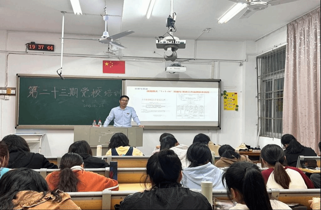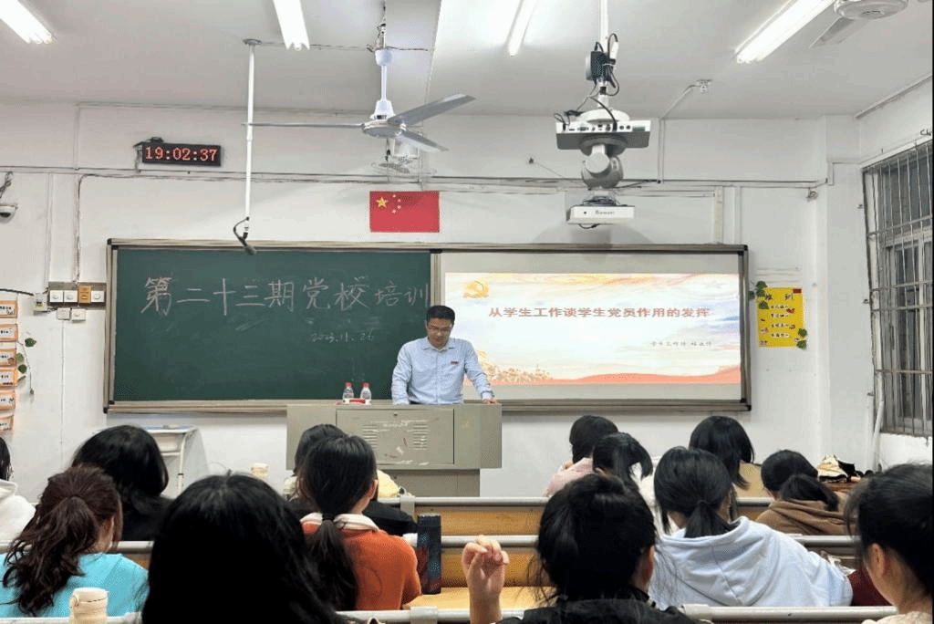 11月26日晚上,我院第二十三期入党积极分子培训第六讲在综南201举行。本次培训以《从学生工作谈学生党员作用的发挥》为主题,由校学生工作处林正锋老师主讲,全体入党积极分子参加。