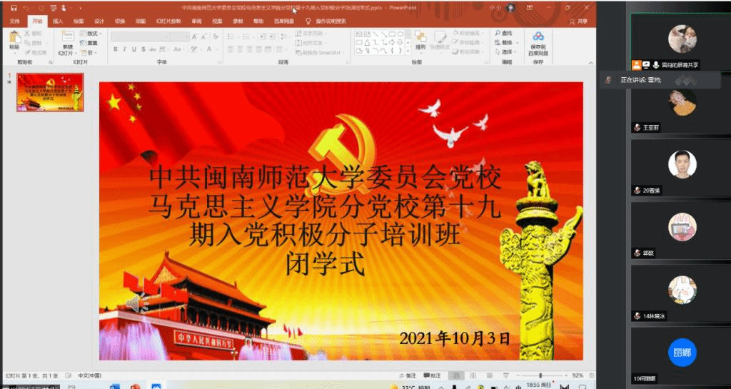 结业式在庄严的国歌奏唱中拉开序幕。随后,由全体入党积极分子组成的七个实践小组选派代表围绕着以“学习七一讲话精神,激发青春奋斗力量”为主题依次开展实践汇报,此次汇报主要从活动目的、形式、流程、意义四方面展开,学员们通过线上收集讨论,深入学习了习近平总书记“七一”重要讲话精神。并在集体学习交流的基础上,在“七一”重要讲话精神的指导下,制定开展了相关的实践活动。