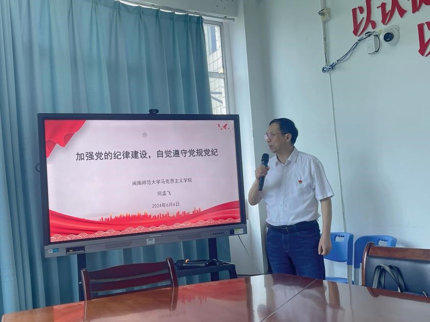 6月6日下午,教工第二党支部书记何孟飞在综东301会议室为支部党员讲授题为《加强党的纪律建设,自觉遵守党规党纪》的专题党课。