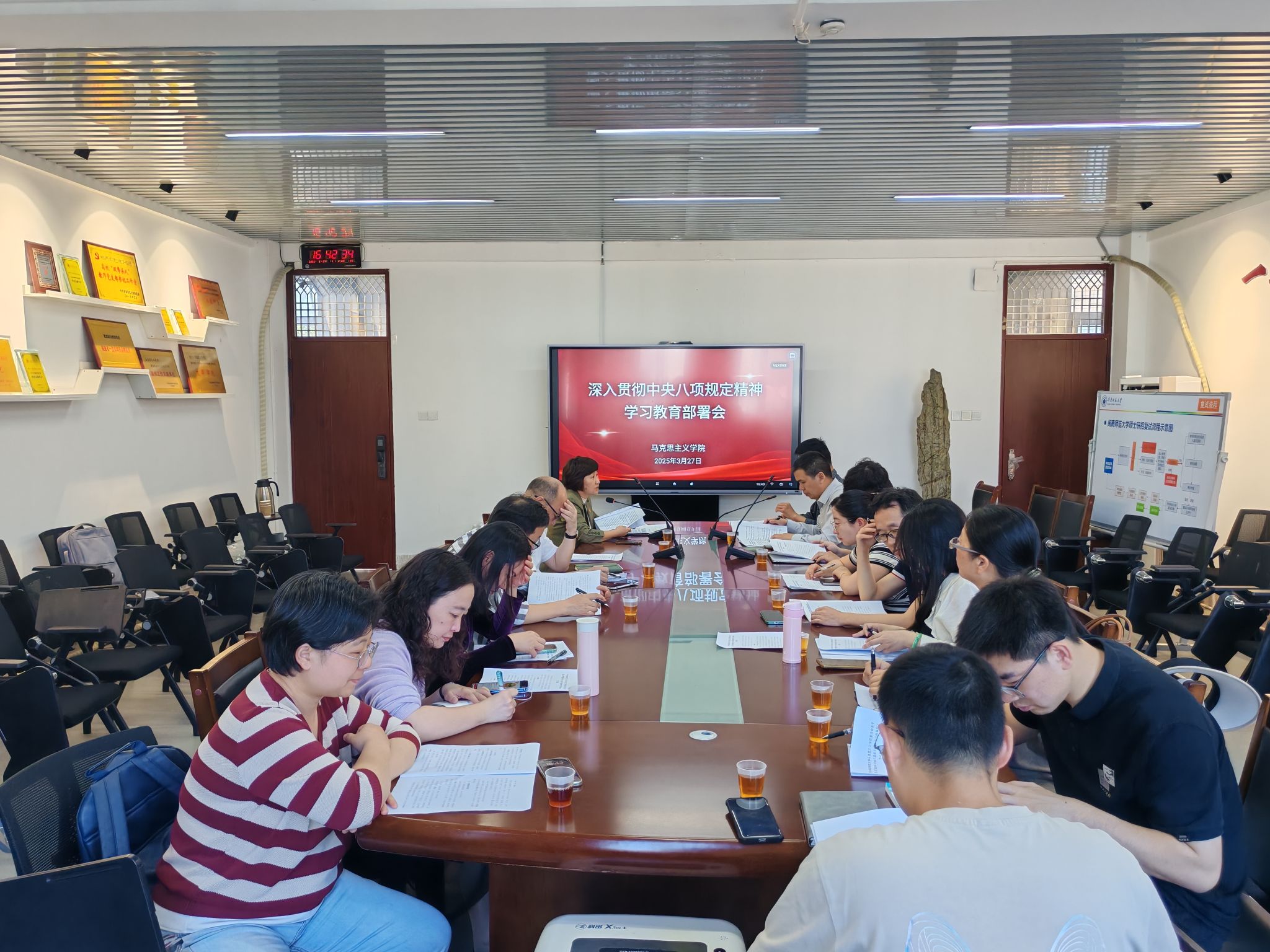 3月27日下午,我院党委在综合楼中区404会议室召开深入贯彻中央八项规定精神学习教育工作部署会。全体党委委员、科级干部、党支部书记参加会议,会议由党委书记方琼主持。