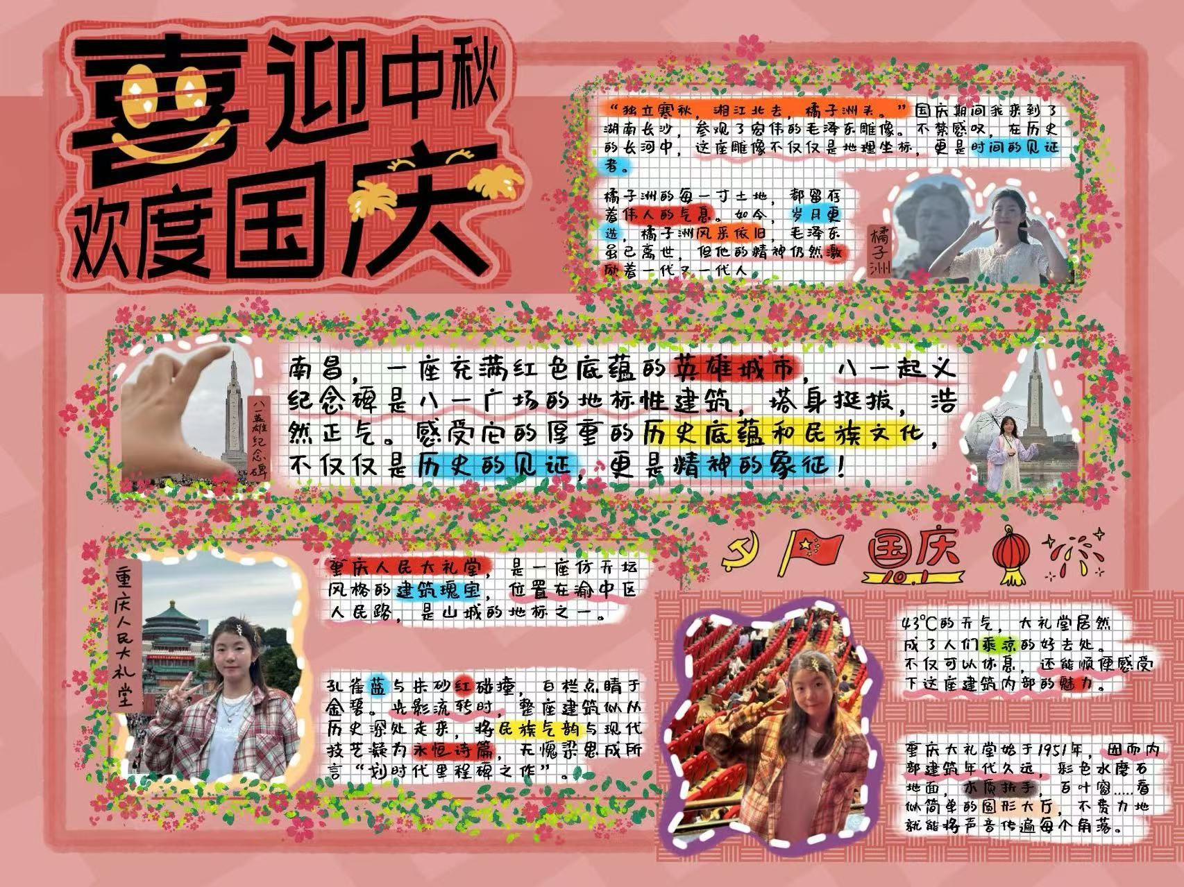盛世华诞,举国同庆。为庆祝中华人民共和国成立76周年,我院团委举办了“光影献礼•笔诉家国”国庆plog手帐征集活动。同学们踊跃参与,以镜头为眸,定格金秋华诞的动人瞬间;以笔尖为舟,流淌真挚炽热的家国情怀。这些斑斓的影像与真挚的文字,共同编织成这个十月最温暖、最昂扬的风景。现在,就让我们一同走进这段由光影与文字共同谱写的华彩篇章吧!