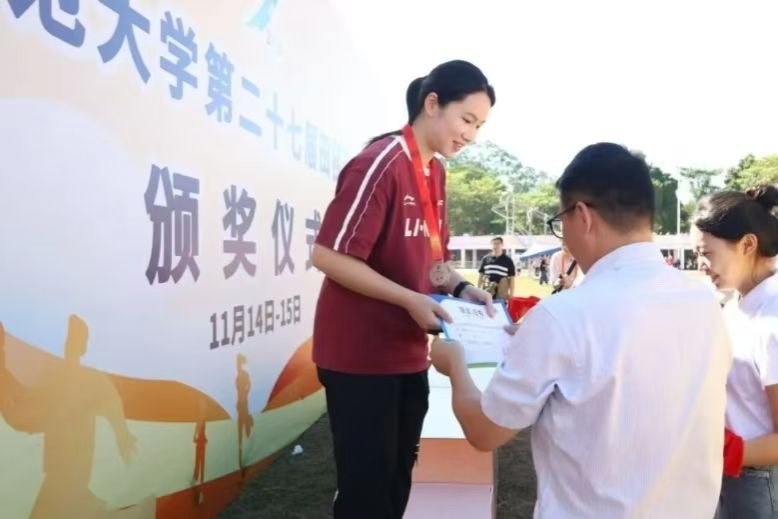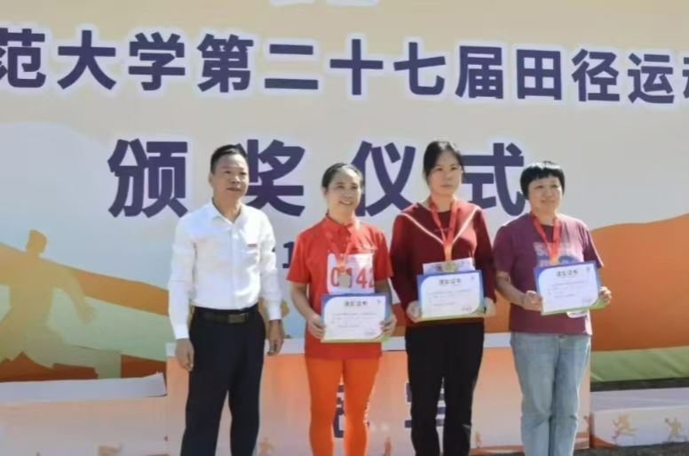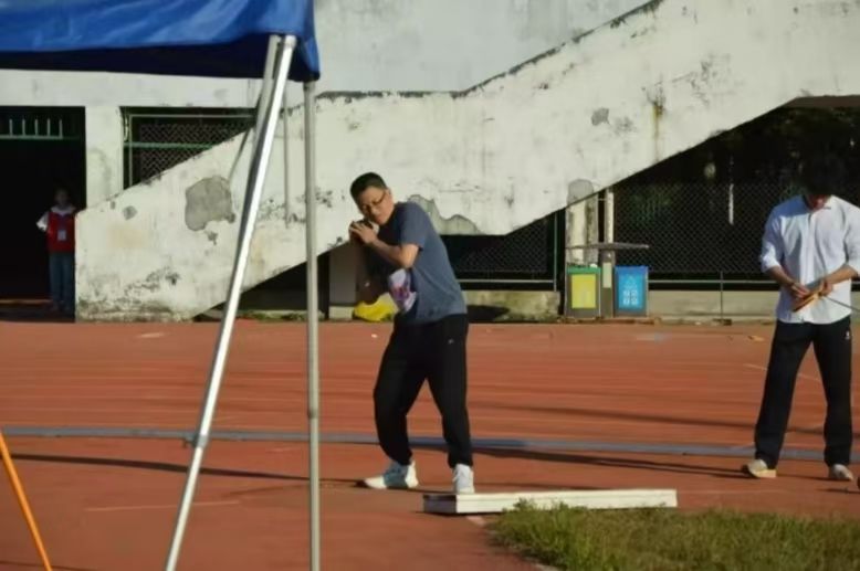 铅球赛场上,那一抹“沉稳灰”格外引人注目——那是讲台之外的另一道风景。灰色,是铅球的本色,沉甸甸的,象征着坚实与可靠;也是师者的底色,不张扬,却蕴含沉稳与专业。当老师凝神屏息、俯身推举,动作或许不似职业选手那般矫健,却自有一种从容的力量。而在颁奖台前,另两位老师接过奖牌,笑容谦和,灰色的身影与胸前的荣誉相映——这一刻,体育的力量与教育的沉淀融为一体,他们以可靠之风,诠释了师者亦行者、讲台亦赛场的精神底色。