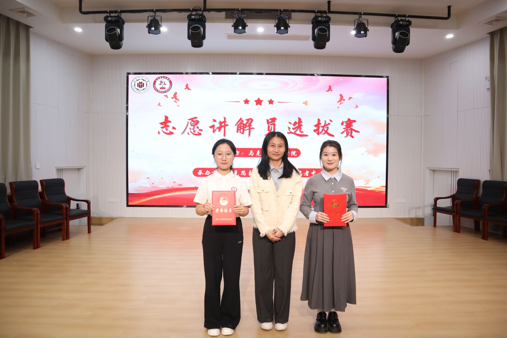 为积蓄奋进力量,传承拼搏精神及家国情怀,11月26日晚,我院于东门马院礼堂举办第二届红色文化志愿讲解员选拔赛。比赛邀请漳州中国女排精神展示馆展陈部主任黄专楠、校党委宣传部陈秋燕老师、校办公室汪先平老师担任评委,我院党委副书记邓战军老师出席,25级本科生蒋明芳、黄雨萱主持。