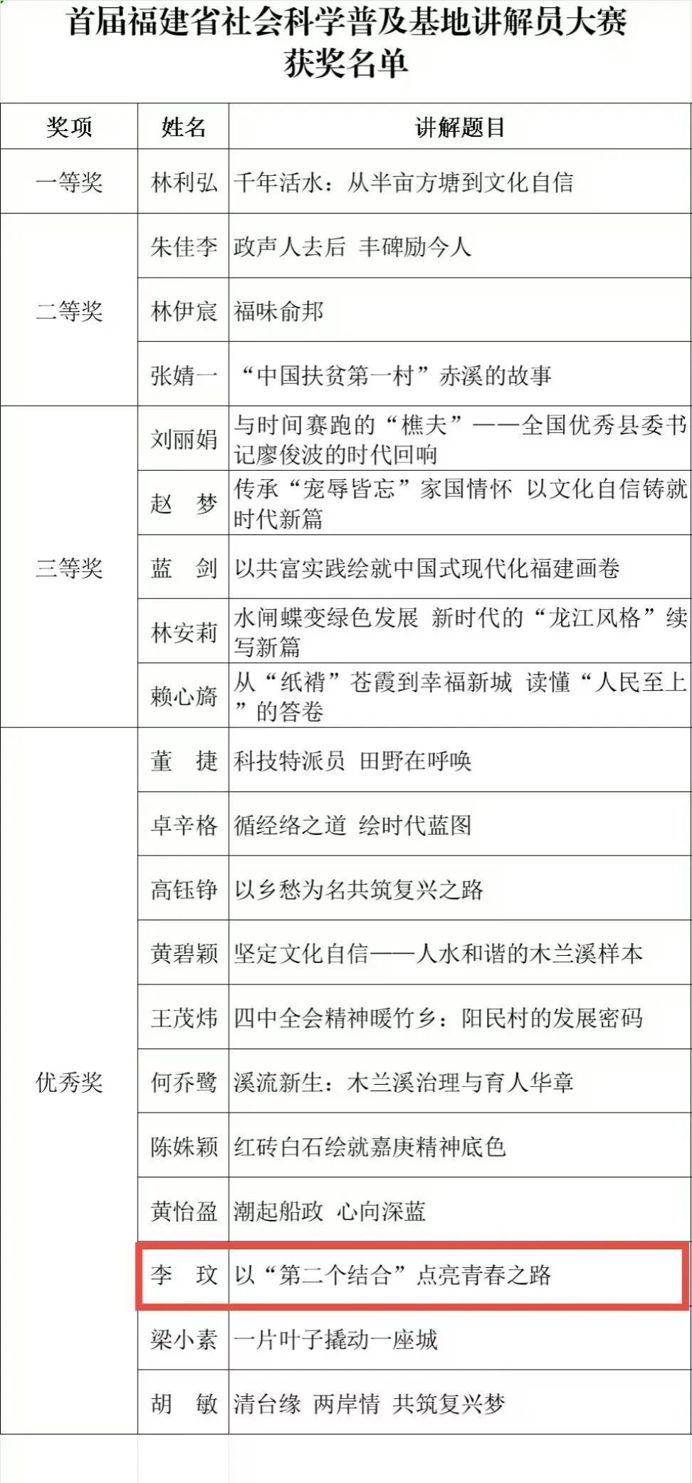 2025年12月30日,经过初赛、复赛的层层选拔和激烈角逐,我院2025级硕士研究生李玟在福建省社科联主办的首届福建省社会科学普及基地讲解员大赛中,与来自尤溪县博物馆、谷文昌纪念馆等省社科普及基地的20名专业讲解员同台竞技,获优秀奖。其参赛作品《以“第二个结合”点亮青春之路》围绕“第二个结合”这一时代课题,结合马克思主义基本原理与中华优秀传统文化,从青年视角阐释了其理论内涵与实践意义。85588永利集团马克思主义科普基地建设以来,我校学子积极参与社科普及、马克思主义科学知识与理论传播,推动了党的创新理论走深走实。