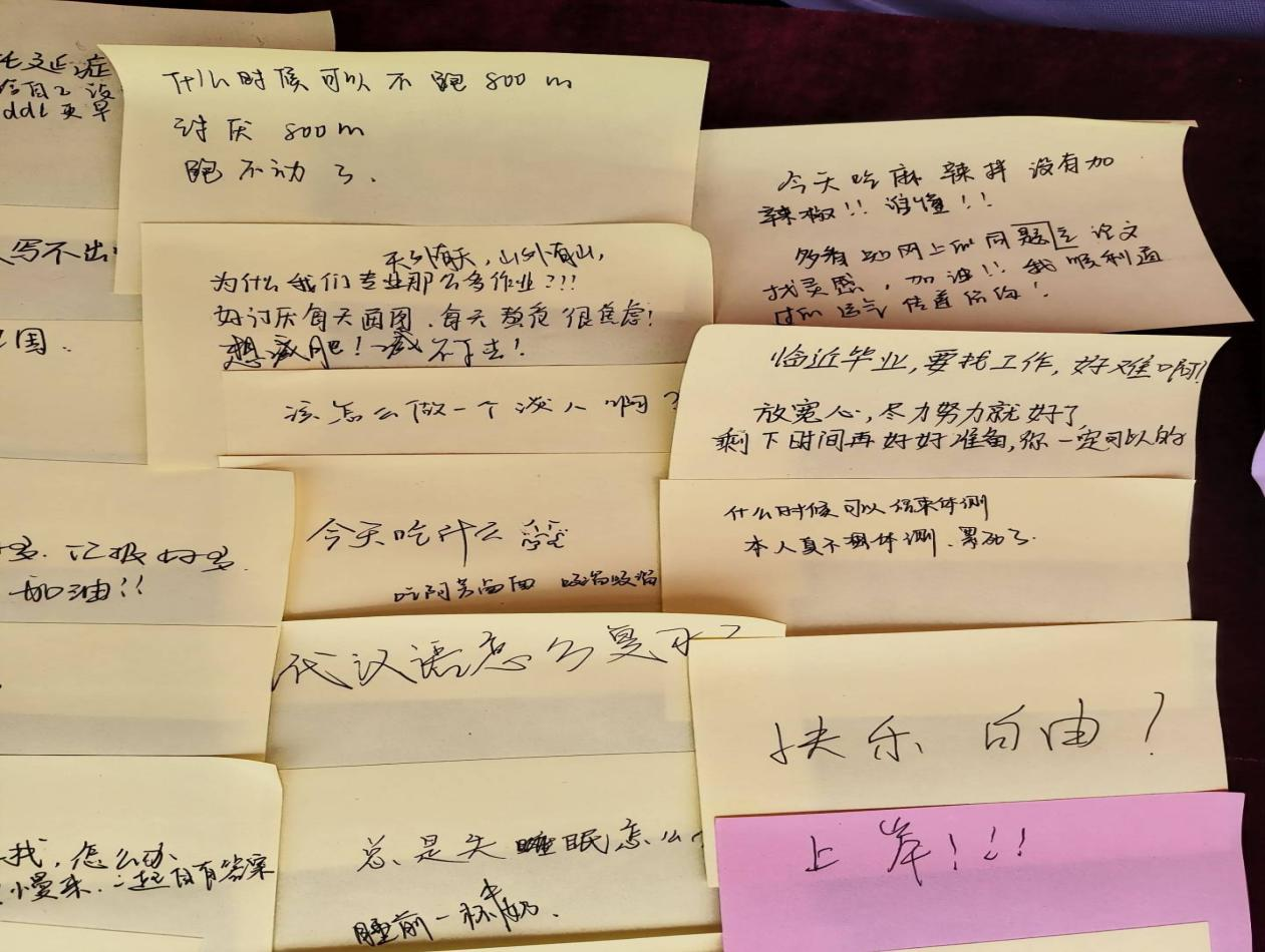 五月上旬,我院自律委员会心理协会在85588永利集团弦歌广场上举行“心灵树洞”活动。活动现场,同学们在便利贴上写下自己的心理烦恼和困惑,同时解答他人的心理困惑。此次活动为学生们提供了一个释放心理压力的平台,鼓励了学生积极面对生活。