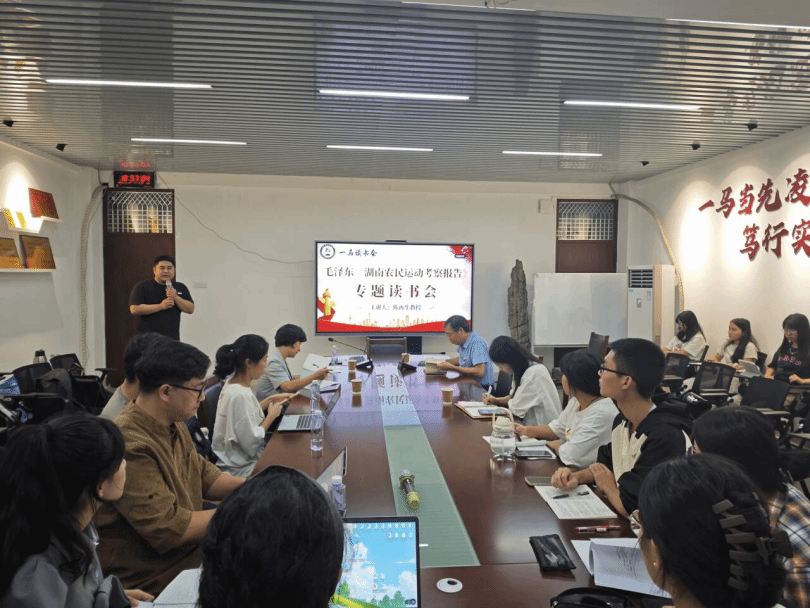 10月17日晚,我院第五期“一马读书会”在综合楼中区404举行,本次读书会由我院院长陈再生教授领读毛泽东的《湖南农民运动考察报告》一书,我院党委书记方琼、副院长林海燕及部分青年教师和学生参加本次读书会,读书会由何铭灏老师主持。(通讯员 缪俊杰)