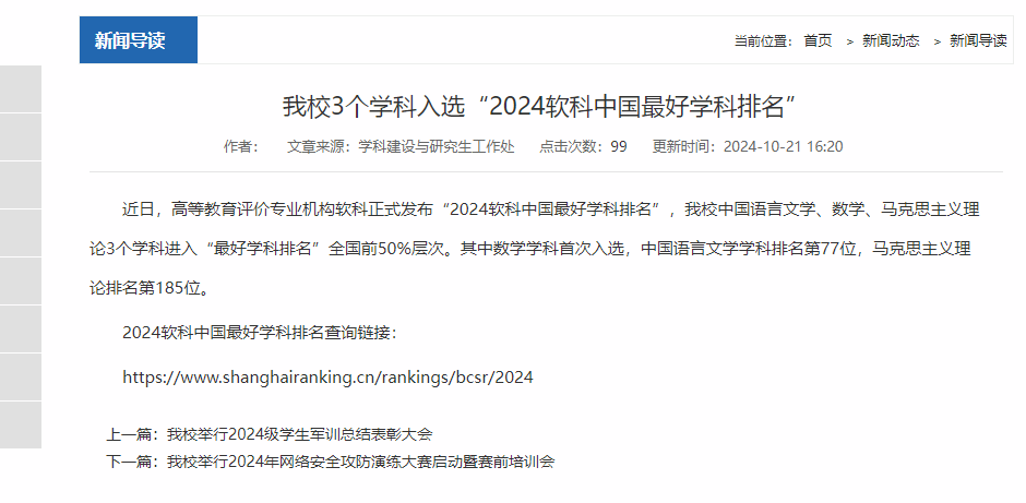 近日,高等教育评价专业机构软科正式发布“2024软科中国最好学科排名”,我校中国语言文学、数学、马克思主义理论3个学科进入“最好学科排名”全国前50%层次。其中我院马克思主义理论学科排名第185位!这彰显了我院深厚的学术底蕴与教学实力。展望未来,我院将牢记“一马当先凌云志,笃行实干先锋人”的院训精神,不忘初心,砥砺前行,勇攀学术高峰!