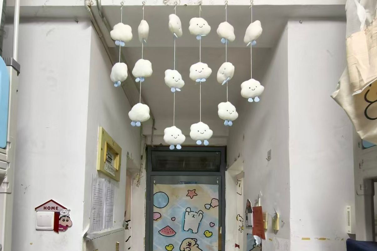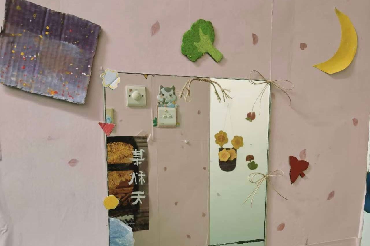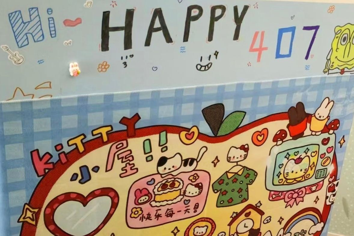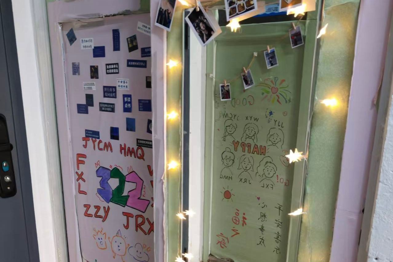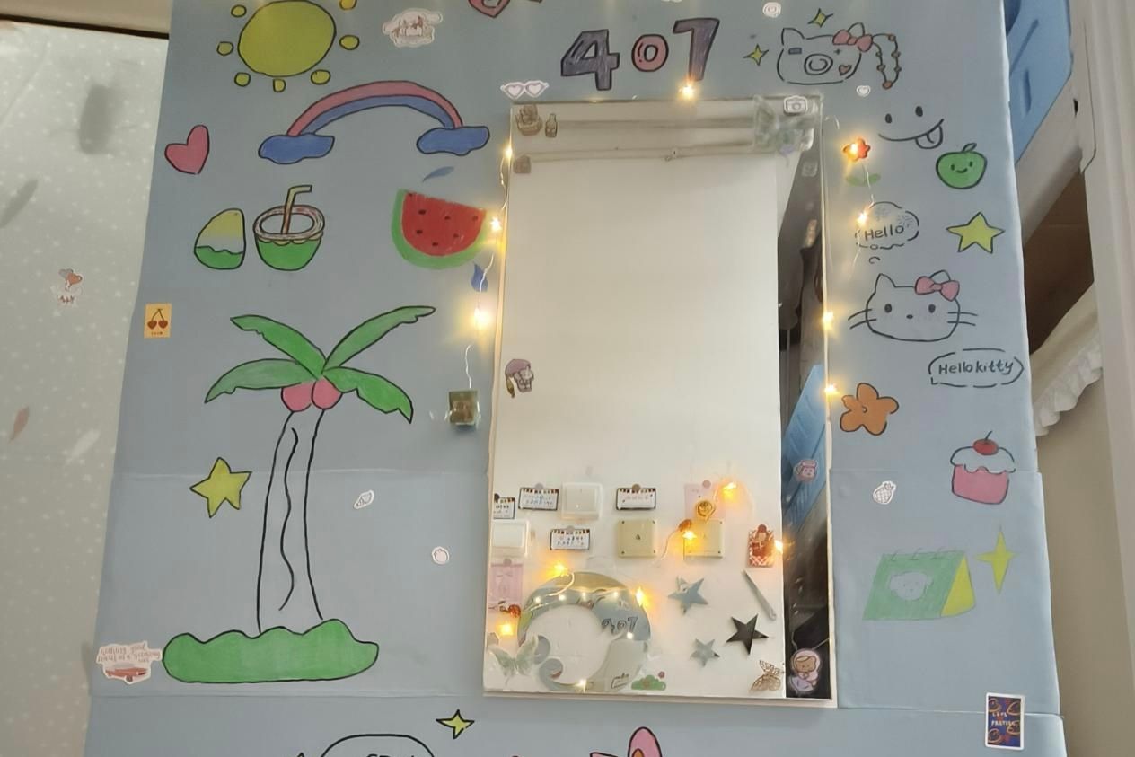 欢迎来到达理2A407宿舍,这里是绿色与个性交织的奇妙空间。宿舍门上,她们牵了一条姜饼人,并就地取材,将从校园里捡来的落花细心地别在上面作为装饰。蓝色的墙纸上是由达理2A407成员们共同绘制的各种可爱简笔画,让整个空间都洋溢着温馨与活力。镜子上装饰着来自各个宿舍成员日常收集的各类贴纸。同时,他们还以星星灯作为装饰,暖调的黄色星光,温暖着回到宿舍的每位成员。阳台的玻璃门也别有洞天。他们用废弃的纸张为材料,细心绘制上具有鲜明民族特色的动物“龙” 。玻璃门上还贴着宿舍成员悉心制作的干花,他们希望将花朵短暂的绽放定格为永恒的美丽。这就是他们的宿舍,一个充满个性、将绿色环保理念的独特空间,是他们绿色梦想的栖地。