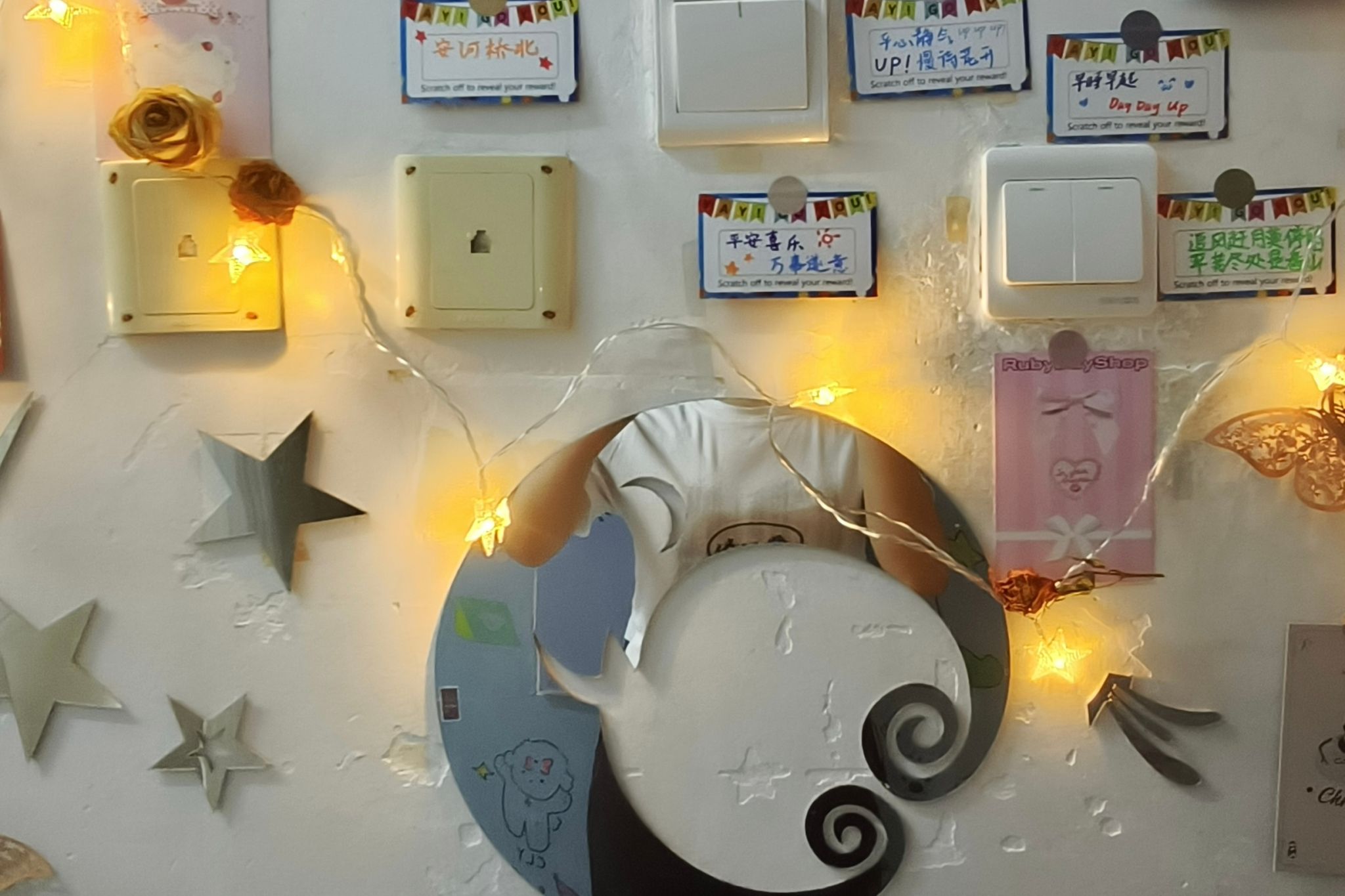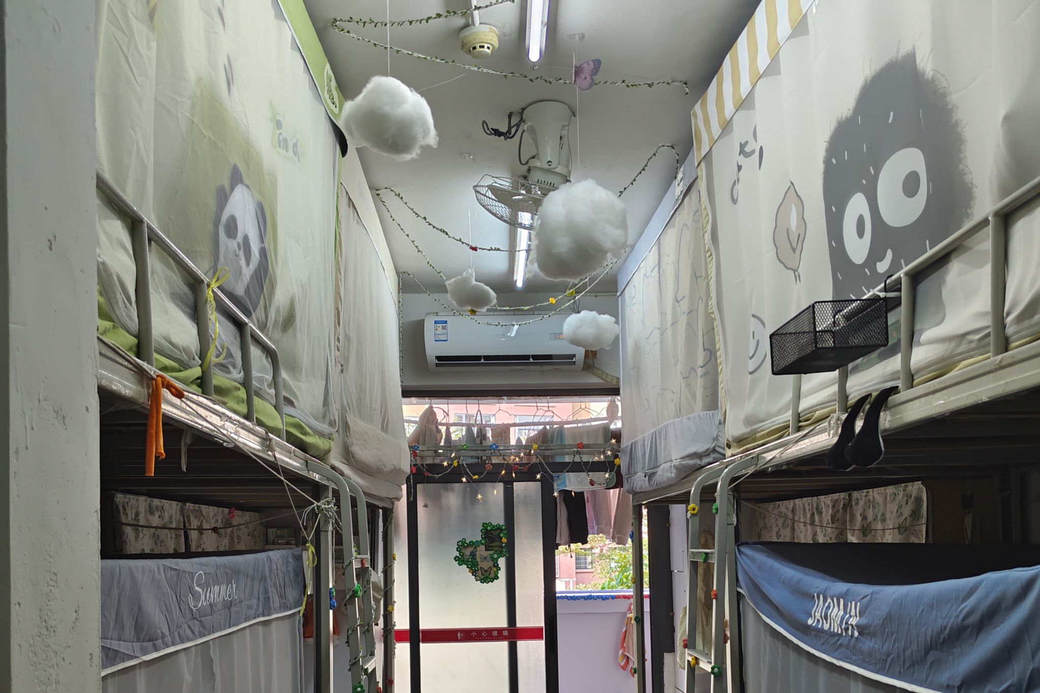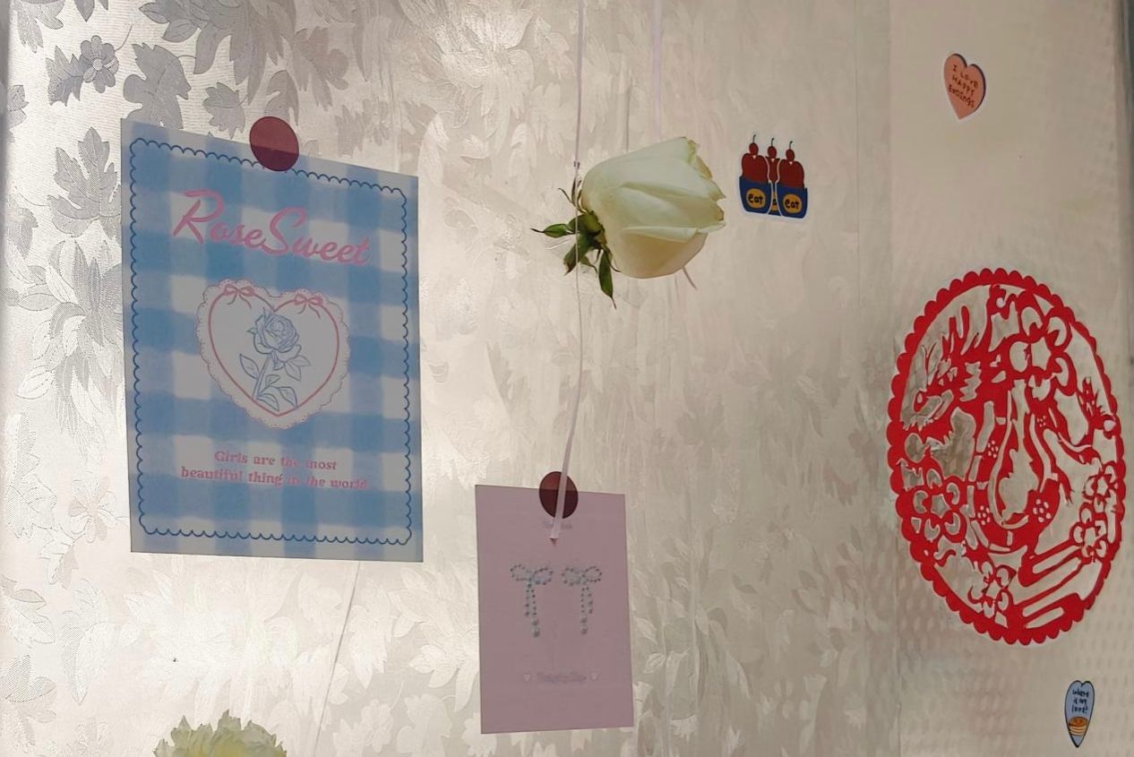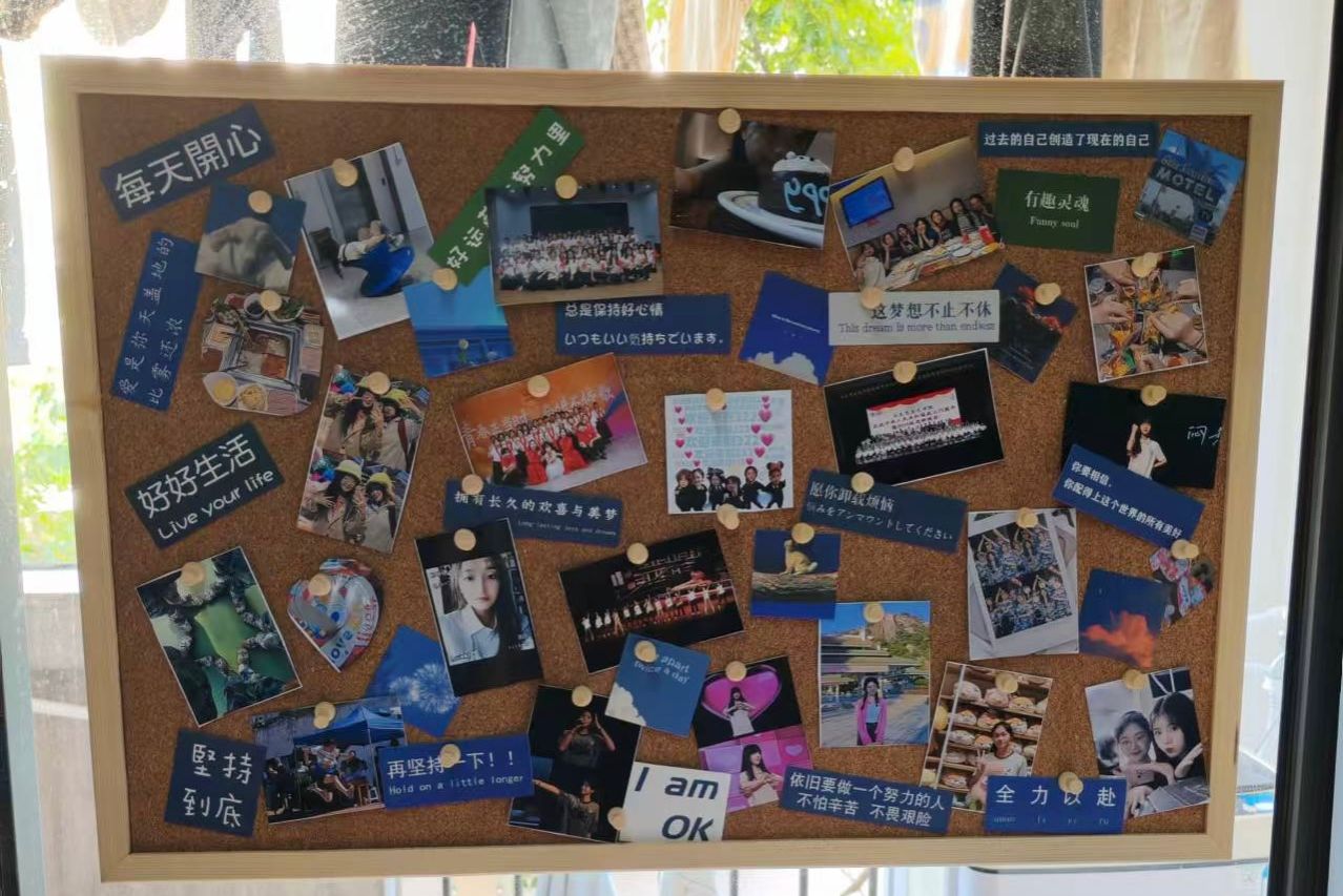 欢迎来到达理2A407宿舍,这里是绿色与个性交织的奇妙空间。宿舍门上,她们牵了一条姜饼人,并就地取材,将从校园里捡来的落花细心地别在上面作为装饰。蓝色的墙纸上是由达理2A407成员们共同绘制的各种可爱简笔画,让整个空间都洋溢着温馨与活力。镜子上装饰着来自各个宿舍成员日常收集的各类贴纸。同时,他们还以星星灯作为装饰,暖调的黄色星光,温暖着回到宿舍的每位成员。阳台的玻璃门也别有洞天。他们用废弃的纸张为材料,细心绘制上具有鲜明民族特色的动物“龙” 。玻璃门上还贴着宿舍成员悉心制作的干花,他们希望将花朵短暂的绽放定格为永恒的美丽。这就是他们的宿舍,一个充满个性、将绿色环保理念的独特空间,是他们绿色梦想的栖地。