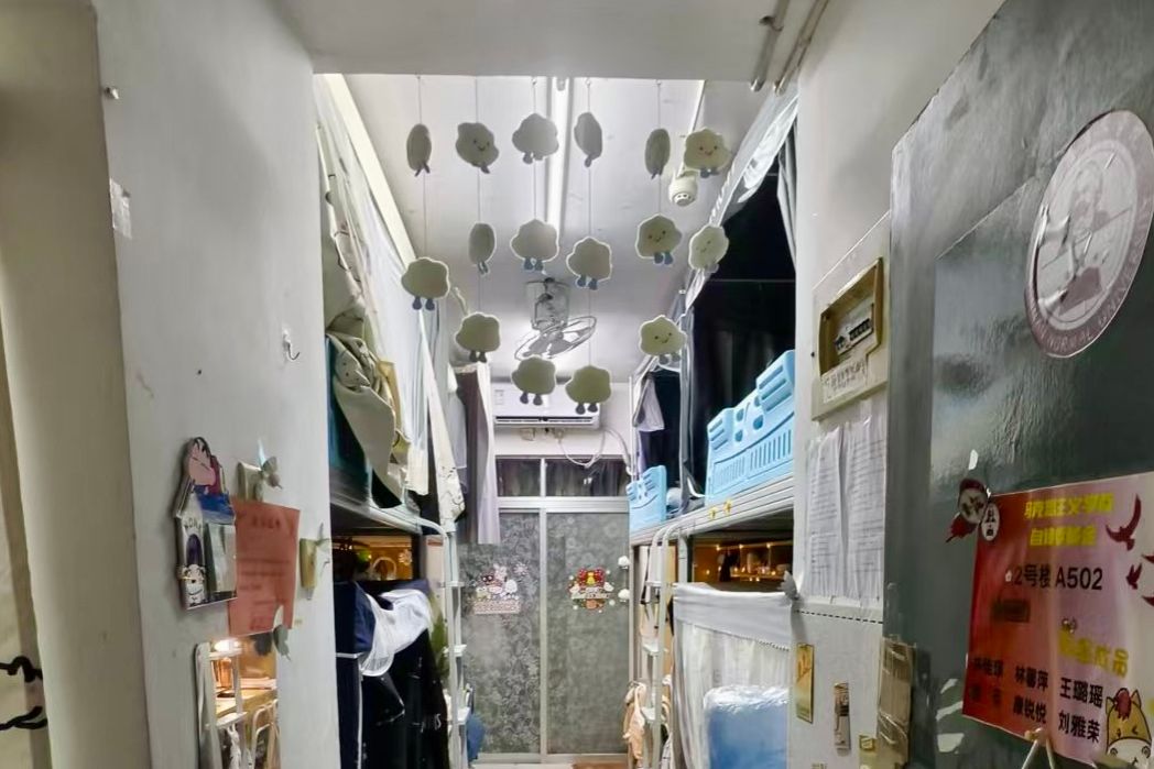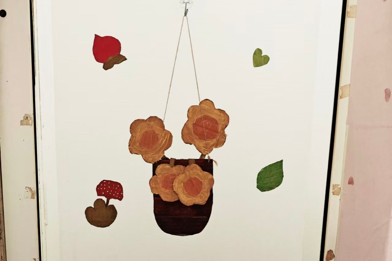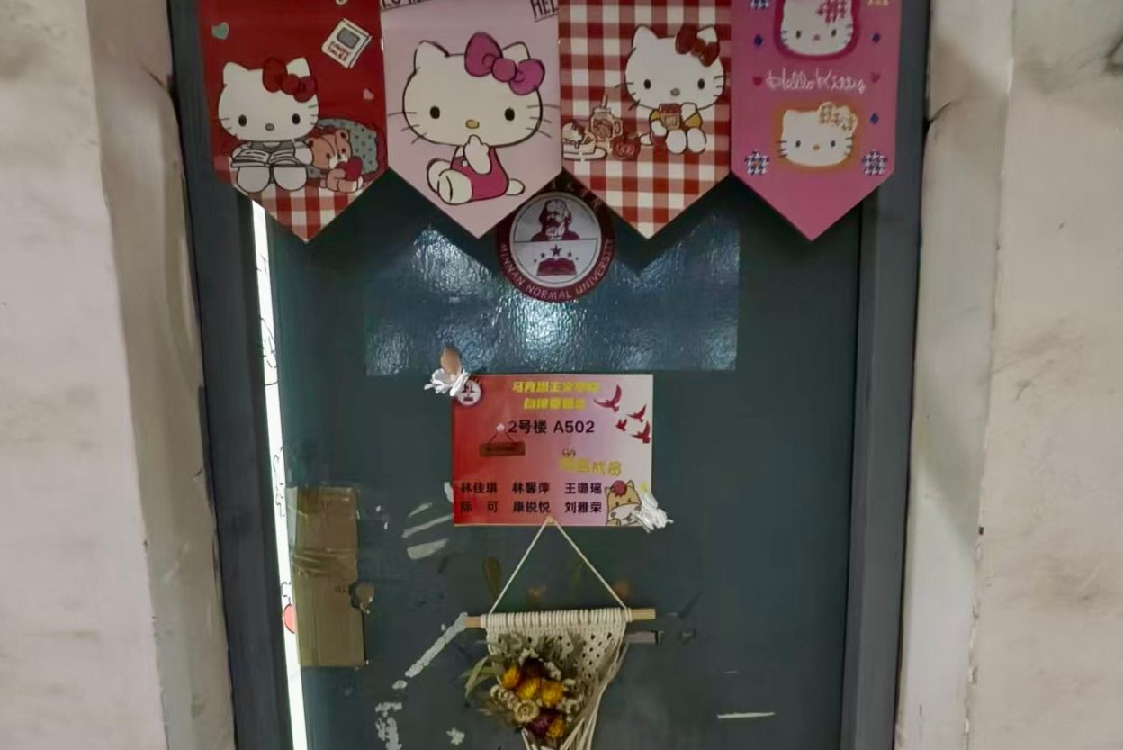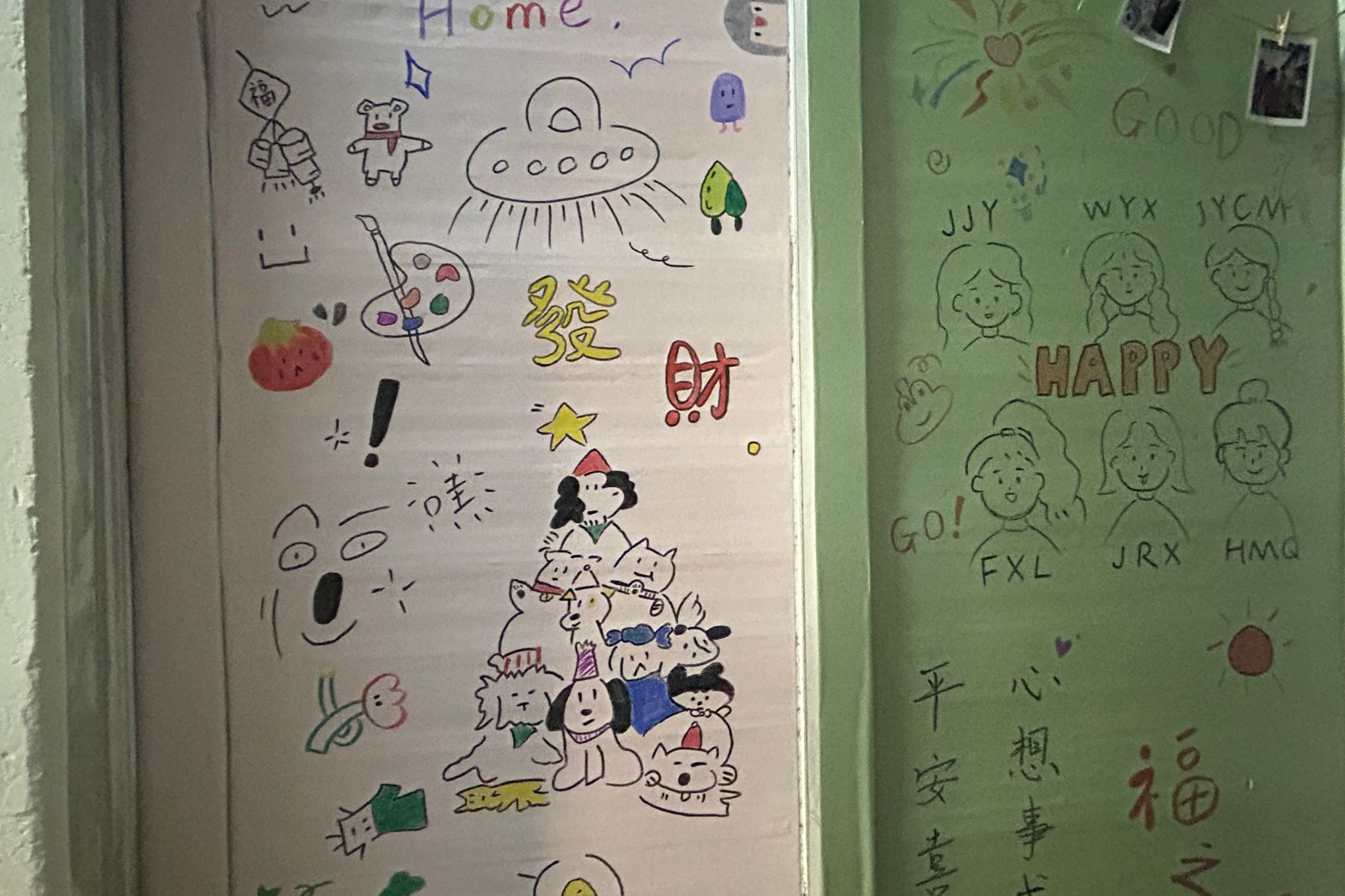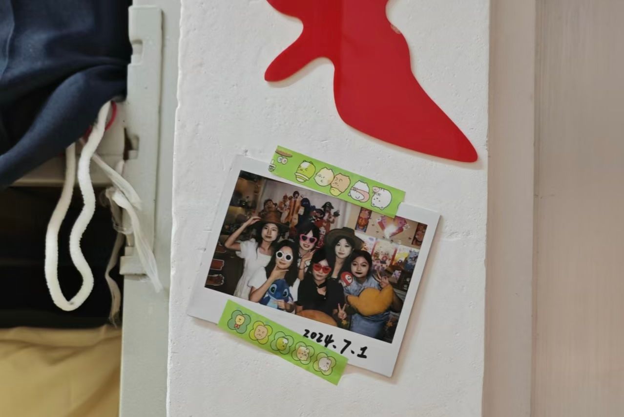 欢迎来到达理2A407宿舍,这里是绿色与个性交织的奇妙空间。宿舍门上,她们牵了一条姜饼人,并就地取材,将从校园里捡来的落花细心地别在上面作为装饰。蓝色的墙纸上是由达理2A407成员们共同绘制的各种可爱简笔画,让整个空间都洋溢着温馨与活力。镜子上装饰着来自各个宿舍成员日常收集的各类贴纸。同时,他们还以星星灯作为装饰,暖调的黄色星光,温暖着回到宿舍的每位成员。阳台的玻璃门也别有洞天。他们用废弃的纸张为材料,细心绘制上具有鲜明民族特色的动物“龙” 。玻璃门上还贴着宿舍成员悉心制作的干花,他们希望将花朵短暂的绽放定格为永恒的美丽。这就是他们的宿舍,一个充满个性、将绿色环保理念的独特空间,是他们绿色梦想的栖地。
