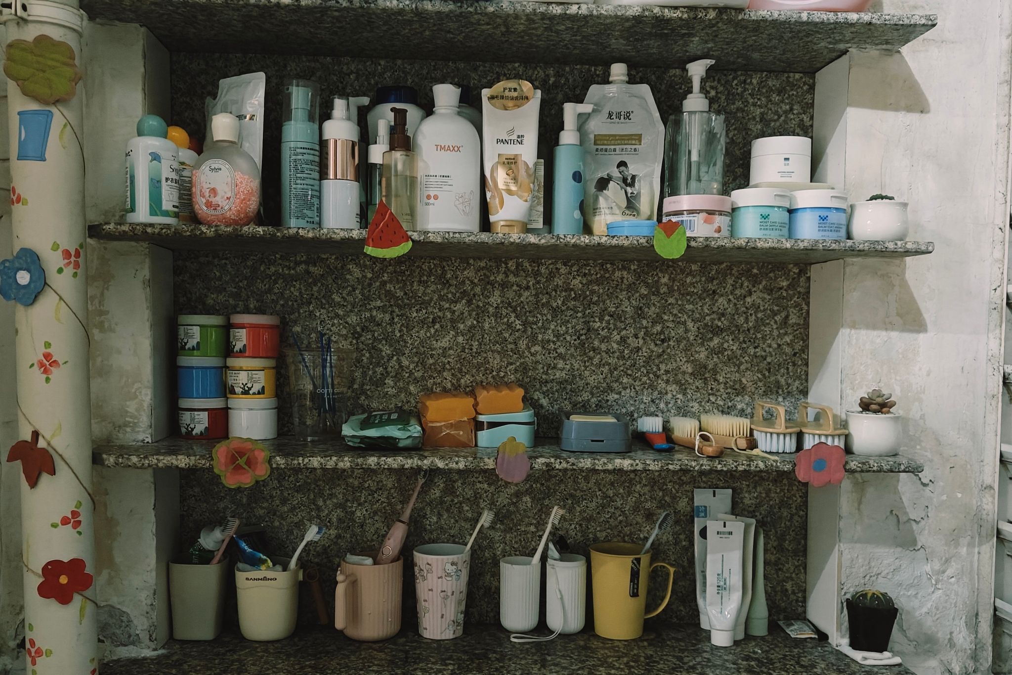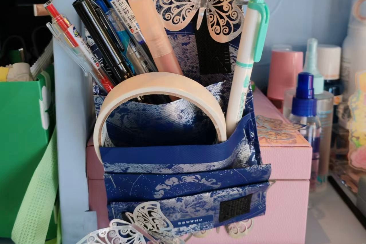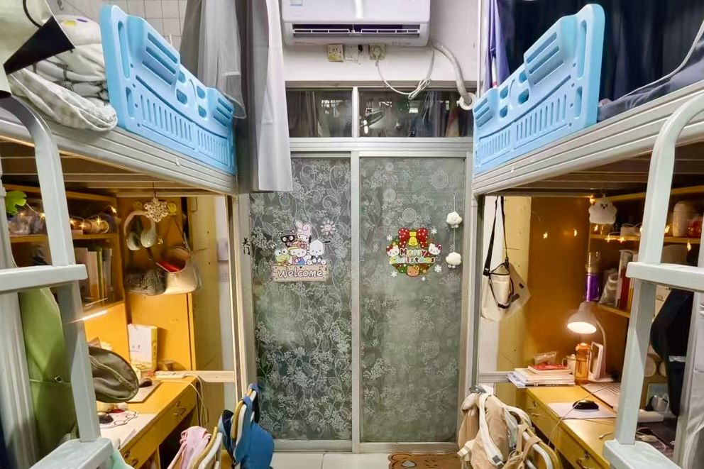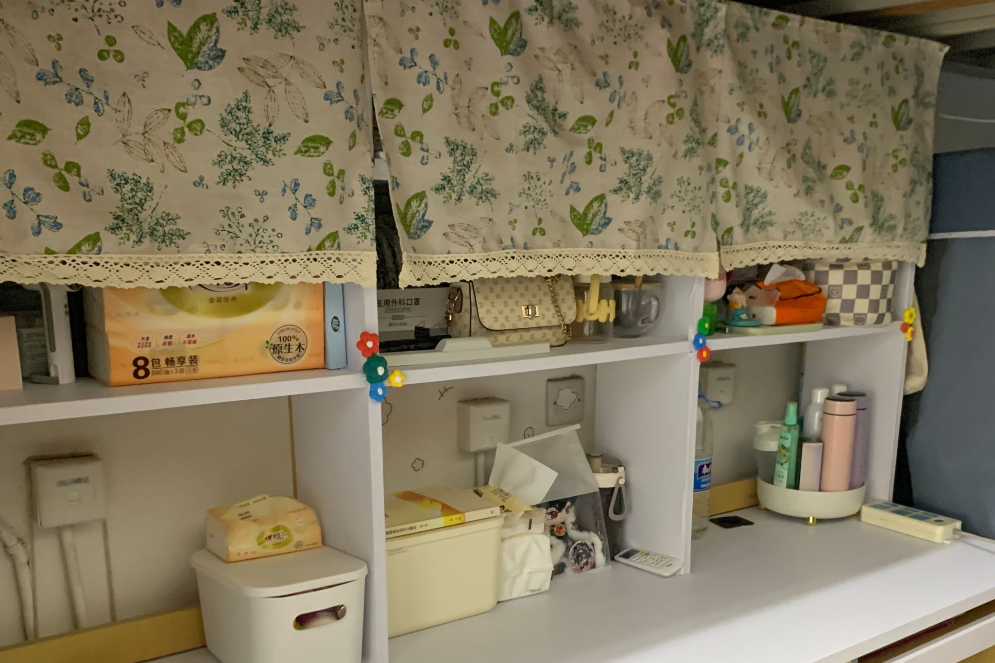 瑞京D北322宿舍以蓝色为主基调,营造了蓝天白云、绿色生态的和谐氛围,这不仅使空间更加贴近自然,还增添了宿舍的生机和艺术感,打造了一个更加舒适宜人的宿舍环境。宿舍成员通过变废为宝的方式,利用废弃奶茶袋、快递盒以及一次性筷子等进行创意装饰,体现了节约环保创新的发展理念。宿舍成员还在浴室门等空间进行创意手绘,结合卡通绘画、照片墙等多种形式,展示宿舍日常生活和成员风采,体现宿舍成员个性以及对未来生活的美好憧憬和愿望。一间温馨浪漫的宿舍、一段真诚浇铸的情感、几个志同道合的人,便组成她们求学生活中最珍贵的家的回忆。