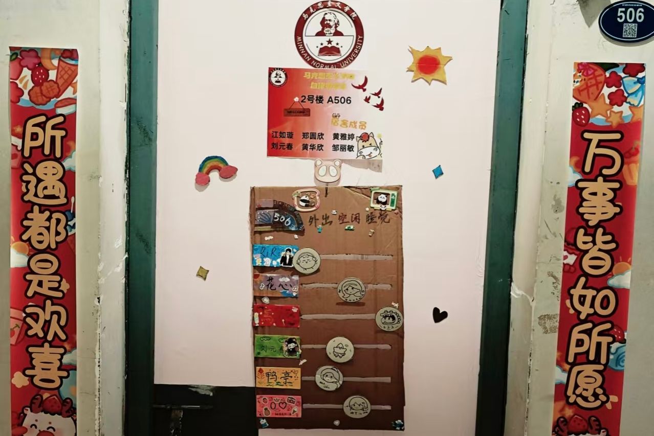 达理2A506宿舍秉持“废物利用”的理念,将快递盒裁剪成宿舍成员情况牌以及多样的小装饰,进行宿舍装饰。宿舍里大部分的装饰品原材料都是快递盒,宿舍成员同心协力,花耗许多时间,分工完成了纸板画图、纸板裁剪、纸板上色、宿舍装饰等活动。而在其他地方,宿舍成员为增加宿舍美观程度,加强宿舍归属感,购置了对联,星星贴,多肉等物品,为宿舍增添一抹亮色。