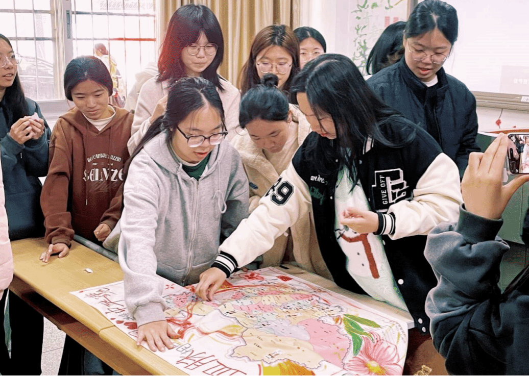 各班级团支部紧扣“铸牢中华民族共同体意识”,以理论为基、实践为桥,充分发挥创新思维,通过理论学习、案例剖析、互动讨论等多样化的形式有序开展,系统学习中华民族共同体意识理论体系,深入探讨其在全面建设社会主义现代化国家新征程中的重要作用。班会期间,同学们积极互动,通过情景模拟、知识竞答等环节,引导同学们树立“铸牢中华民族共同体意识”的理想信念,厚植团结爱国之情。激励同学们在实现中华民族伟大复兴的征程中贡献智慧与力量,让民族团结之花在新时代绽放更绚丽的色彩。值得一提的是,23思政一班通过“共绘民族地图”这一创新形式,将理论学习与实践体验相结合,这一寓教于乐的沉浸式体验,以指尖的温度传递文化认同,用视觉语言诠释民族团结的时代内涵,成为班会中一抹亮色。