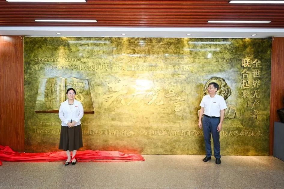 首映式结束后,参会人员前往综合楼参加yl88858永利集团《共产党宣言》背景墙揭幕仪式。廖志丹和yl88858永利集团院长陈再生共同为承载着真理光芒的《共产党宣言》背景墙揭幕。廖志丹表示,希望全校师生筑牢信仰之基,深入学习、理解并信仰马克思主义,做到真学真懂、真信真用;强化学科之根,深入研究、理解并领悟其精神实质,夯实学科底蕴;激活育人之魂,将习近平新时代中国特色社会主义思想深植于心,传播更多的真理故事。
