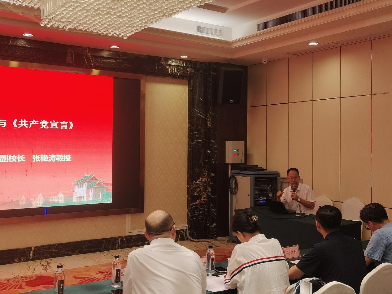 厦大党委党校副校长张艳涛教授倾情讲授《中国共产党与〈共产党宣言〉》。张教授首先明确为什么要研读《共产党宣言》,随后从国内外背景出发讲述《共产党宣言》的诞生、几篇重要序言、中译本。随后,张教授全面分析“为人类构建了一个意义世界”“消灭私有制”“两个必然”等共产党宣言的主要观点,最后强调中国共产党是《共产党宣言》的忠实传人,要学精用好用活《共产党宣言》。