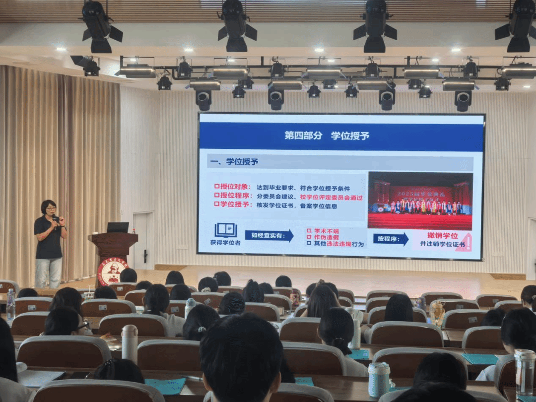 9月17日下午,我院在东门梯教二楼举行了研究生管理规定解读会,会议由研究生辅导员沈书伊主持,校学生处研究生发展服务科科长刘秀英老师主讲,为新生细致拆解研究生管理规则。通过案例结合条文的方式,明晰学术道德“高压线”、学籍管理“流程图”、奖惩制度“明细单”,让新生明确守住学术底线、用好制度资源,为研途筑牢规则意识与权益认知。