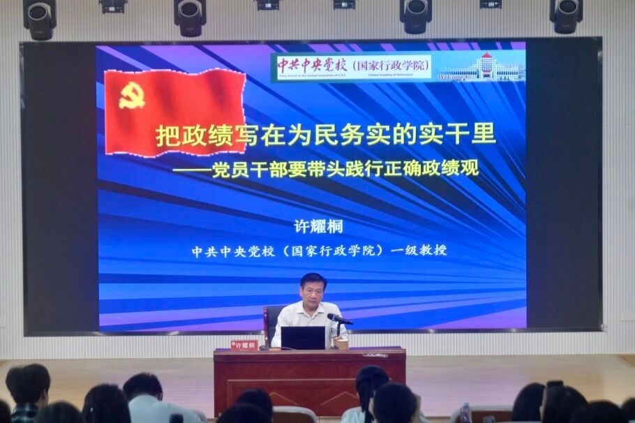 报告会上,许耀桐教授以《把政绩写在为民务实的实干里 —— 党员干部要带头践行正确政绩观》为题,围绕树立正确政绩观和正确的“五观”、当前党员干部政绩观存在的问题、践行和落实正确政绩观主要途径三个维度作了深入系统阐释。许教授紧扣习近平总书记关于正确政绩观的重要论述,深刻解读“政绩为谁而树、树什么样的政绩、靠什么树政绩” 这一根本问题,结合丰富生动的案例,系统讲解正确政绩观与世界观、人生观、价值观、权力观、事业观的内在联系,深刻剖析当前党员干部政绩观存在的突出问题,提出党员干部践行正确政绩观的实践路径与方法要求。报告视野宏阔、论述深刻、重点突出,兼具理论高度与实践指导性,为全院师生党员深化思想认识、校准行动方向提供了指引。