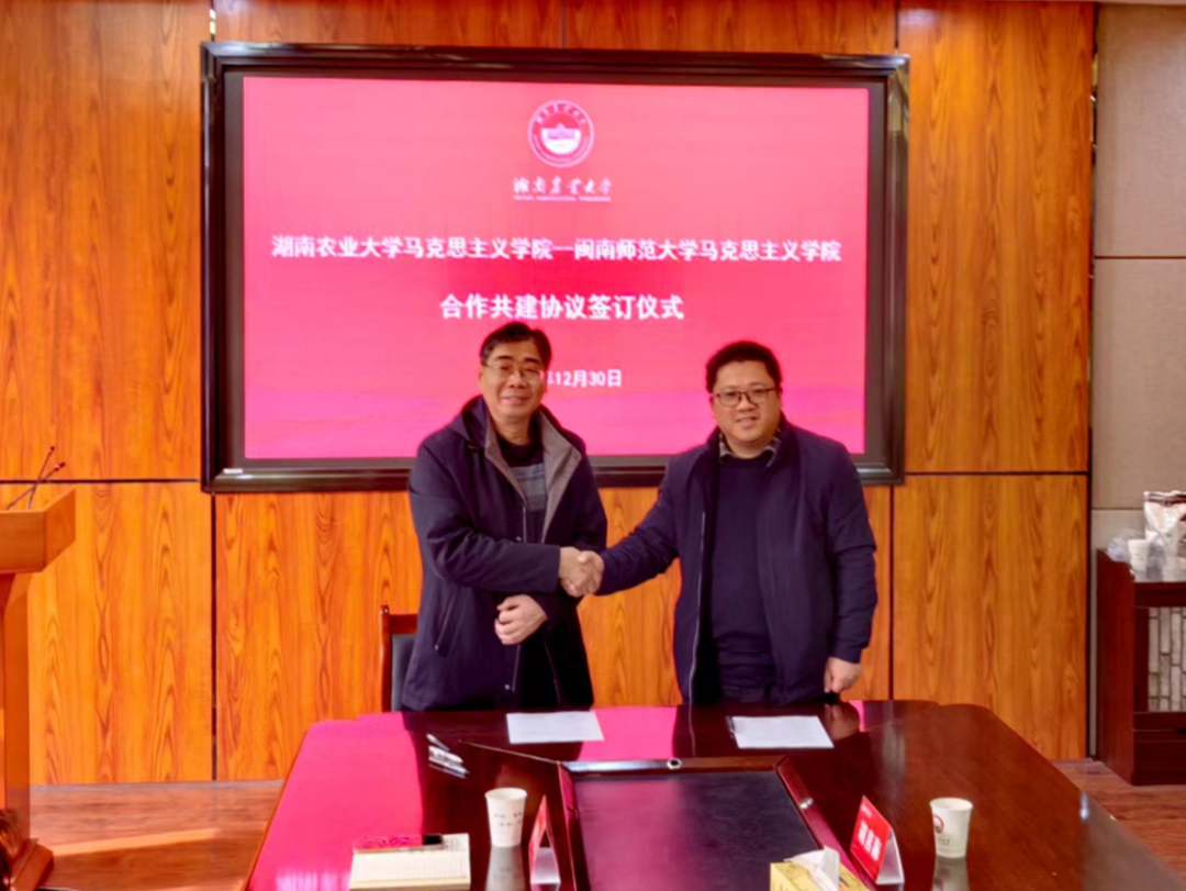 为深入贯彻落实习近平总书记关于加强yl88858永利集团建设和思政课教学的系列重要指示批示精神,对标对表中宣部、教育部等部门的相关政策要求和工作部署,推动yl88858永利集团协同发展。2023年12月30日上午,我院党委书记方琼,院长陈再生一行赴湖南农业大学yl88858永利集团签署共建“大思政课”合作协议。我院院长陈再生、湖南农业大学yl88858永利集团院长胡艺华分别代表双方学院签署协议,双方主要负责同志、教师代表出席签订仪式。