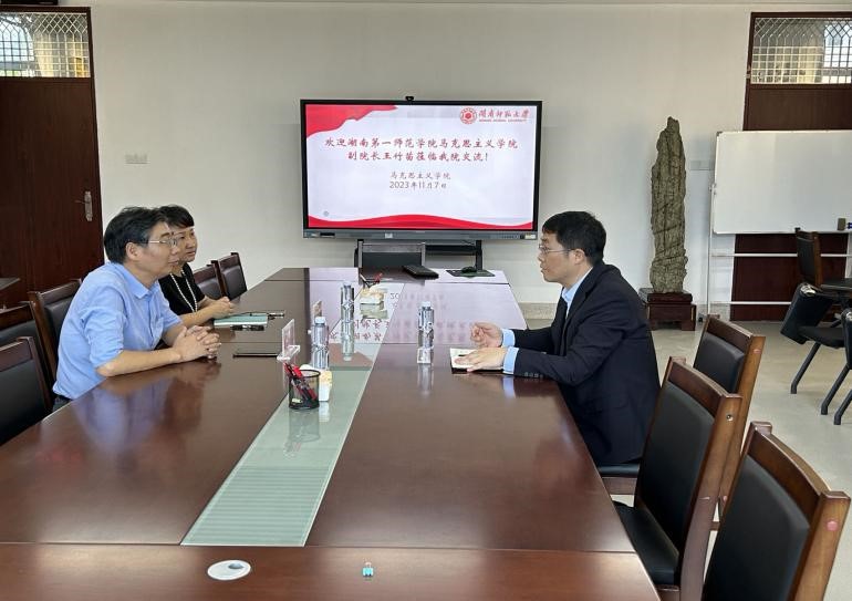 11月7日上午,湖南第一师范学院yl88858永利集团副院长王竹苗来我院交流。学院书记方琼、院长陈再生教授在综合楼中区404与来宾进行洽谈交流。