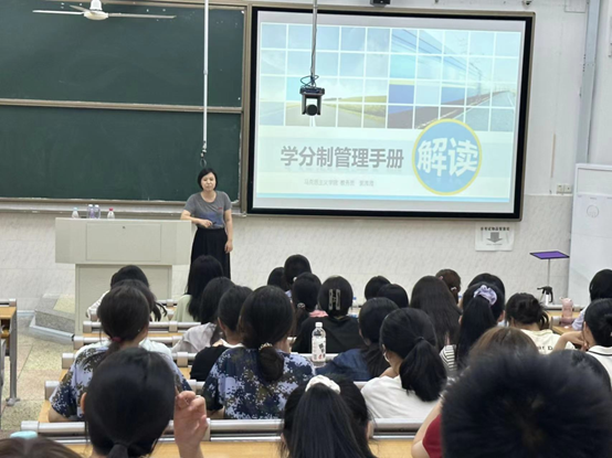 9月19日晚上,学院教务科在圆山校区旧108教室为2023级思政专业新生进行学分制手册解读,郭微微老师主讲。(通讯员:彭飞雪)