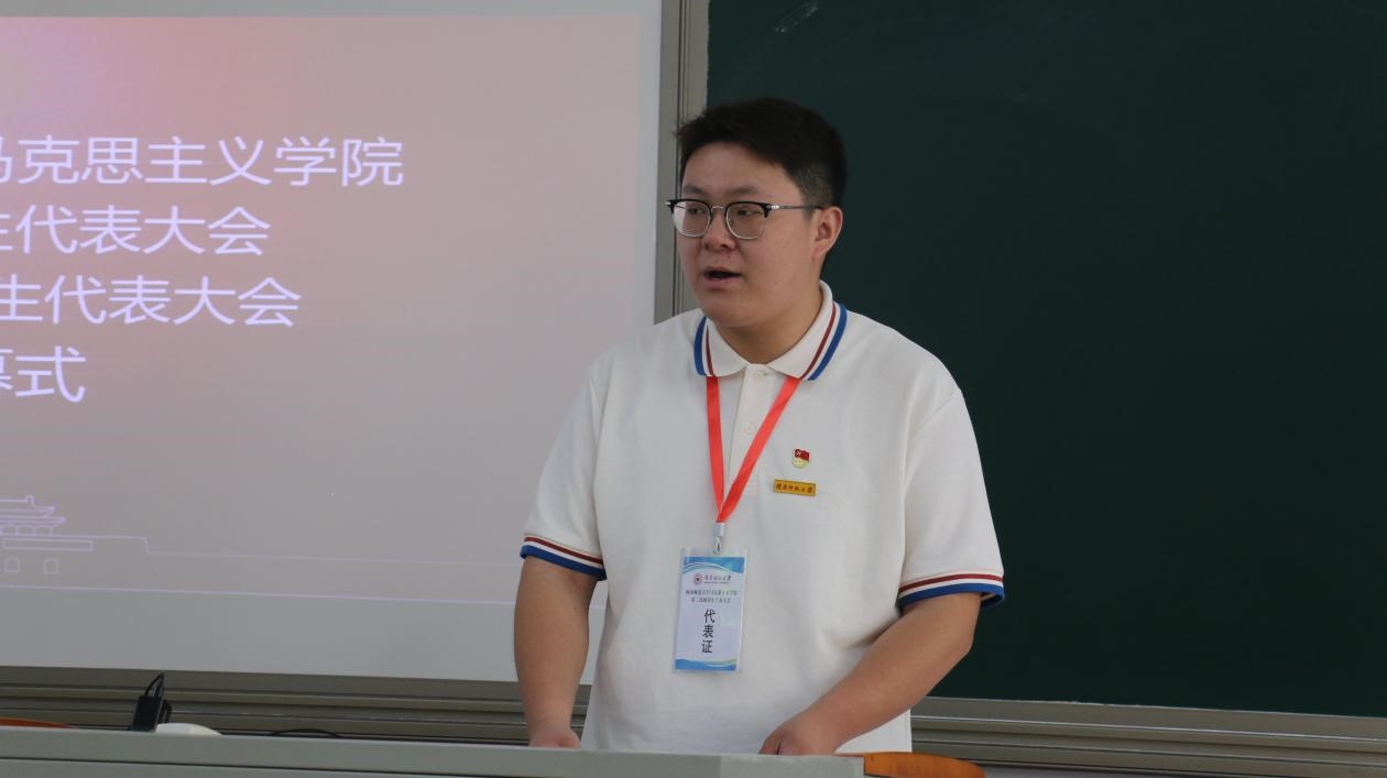 院团委副书记潘怀杰在开幕式上讲话。他代表学院向大会的召开表示热烈的祝贺,对我院学生会、研究生会的工作给予了充分肯定,并对全院广大青年学生和各级学生组织提出了希望和要求:新时代的马院学子,要在爱马、信马中坚定理想信念,大力弘扬爱国主义精神,要把学到的知识与技能转化为推动国家发展、社会进步的动力。以实际行动争做立场坚定、勇于担当、向上向善的新时代青年。我院学生干部要以这次大会的胜利召开为起点,真正地把本次大会的精神带到广大同学中去,广为宣传,有效落实,团结和带领全院同学,立足学院实际,以行动创造新的业绩,谱写更加灿烂的青春篇章。
