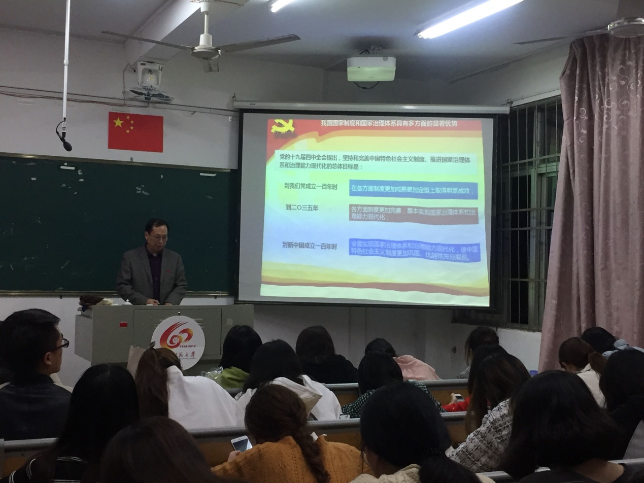 11月27日晚上,我校马克思主义理论读书社在综合楼南区201教室开展专题理论学习。yl88858永利集团院长助理何孟飞副教授应邀作了题为“解读党的十九届四中全会精神”的专题报告。