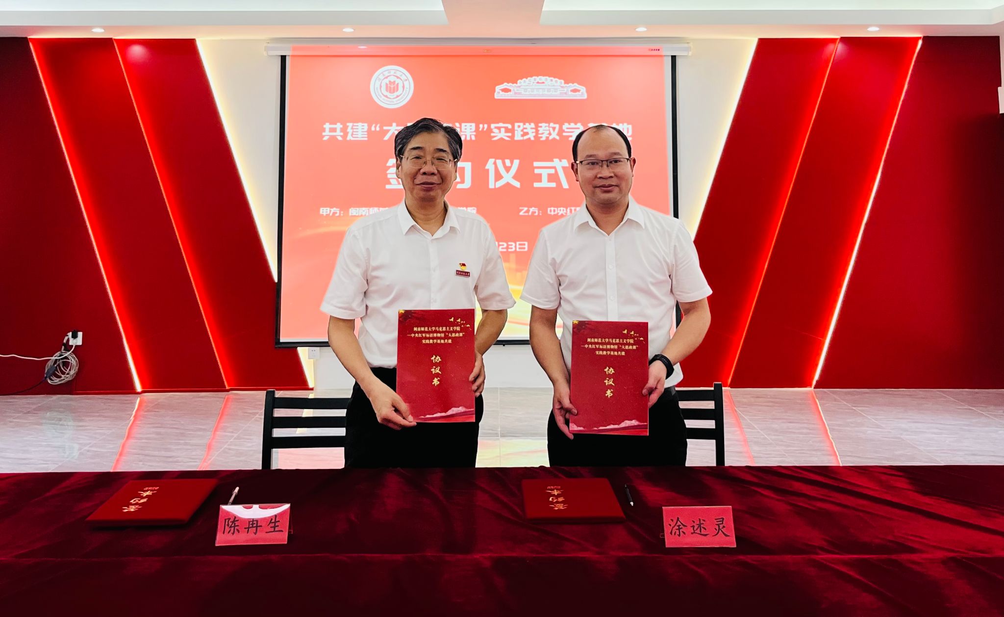 为更好推进“大思政课”建设,推动“思政小课堂”与“社会大课堂”协同育人,培养学生爱国热情,激发大学生做有理想敢担当的有为青年,成为堪当民族复兴重任的时代新人,6月23日上午,我院与中央红军标语博物馆签订“大思政课”实践教学基地协议。我院党委书记方琼、院长陈再生、永安市洪田镇党委书记涂述灵、永安市委党史和地方志研究室主任郑毅以及双方主要负责同志、师生代表参加签约仪式。