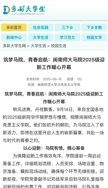 1、多彩大学生网:筑梦马院,青春启航:闽南师大马院2025级迎新工作暖心开幕