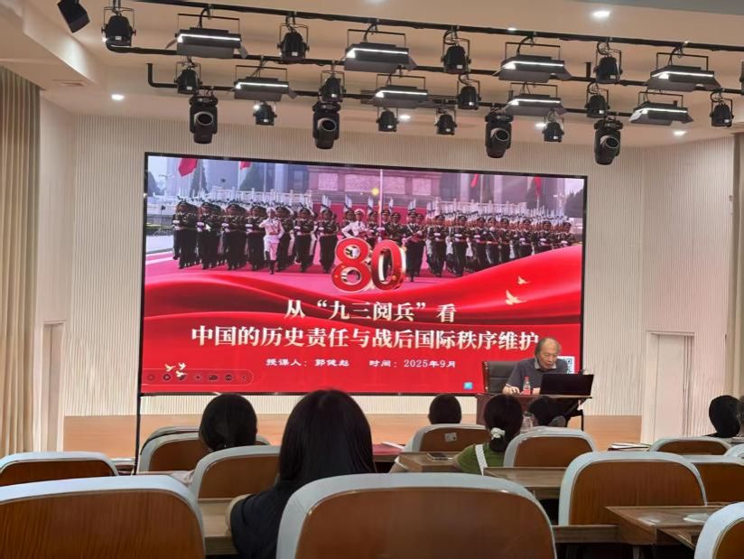 9月25日,福建江夏学院yl88858永利集团首任院长郭健彪教授到我校东门梯教二楼报告厅为我院师生作“从九三阅兵看中国的历史责任与战后国际秩序维护”专题讲座,院党委副书记邓战军主持。(通讯员 周榆幸)