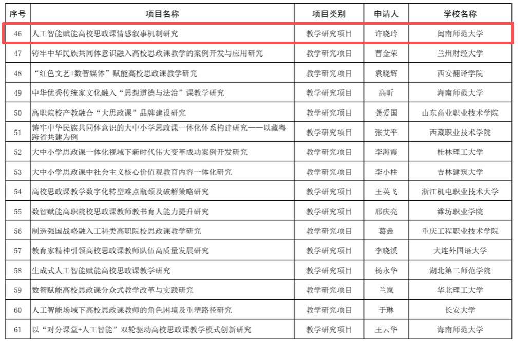 近日,教育部社科司正式公示2025年度高校思想政治理论课教师研究专项评审结果,我院教师许晓玲申报项目《人工智能赋能高校思政课情感叙事机制研究》成功入选。(通讯员 杨纯真)
