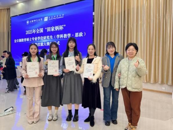 12月7日,我院“三人行”师生成长工作室教师团队于江西师范大学指导2025年全国“田家炳杯”全日制教育硕士专业学位研究生(学科教学·思政)教学技能大赛,我院24级学科教学(思政)专业黄诗琴同学荣获全国二等奖,陈美美同学荣获全国三等奖,韩瑜同学荣获全国优秀教学设计奖,郑育琛教授荣获优秀指导教师奖。(通讯员 杨纯真)