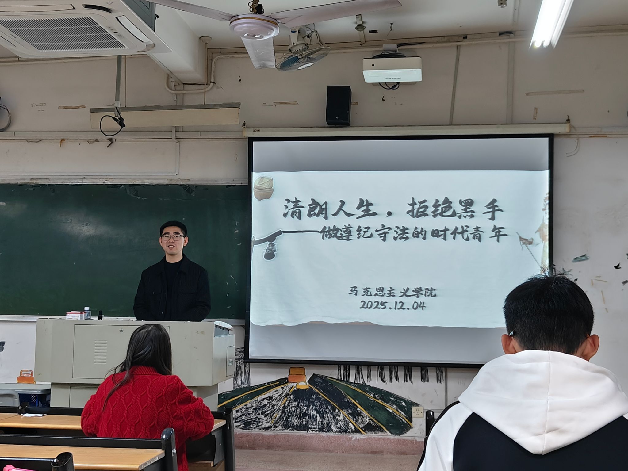 为进一步增强我院学生法律意识,自觉抵制非法行为。12月4日,我院于博中603召开“晴朗人生,拒绝黑手”——做遵纪守法的时代青年主题班会,本次班会由辅导员任程龙主持,2023级全体本科生参加。(通讯员 黄娇萍)