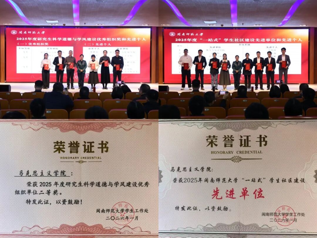 1月23日,我院在校2025年学生工作总结表彰大会上荣获“研究生科学道德与学风建设优秀组织单位”和“学生社区建设先进单位”称号,团委书记潘怀杰和辅导员沈书伊获评先进个人。同时,我院还获得2025年学生工作提质增效工作项目一般立项和2026年思想政治工作精品项目一般立项。(通讯员 齐凯凯)