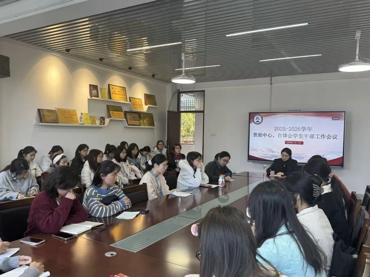 3月10日下午,我院资助中心、自律会在综合楼中区404召开2025—2026学年春季新学期学生干部会议,会议由指导老师沈书伊主讲。(通讯员 洪心怡)