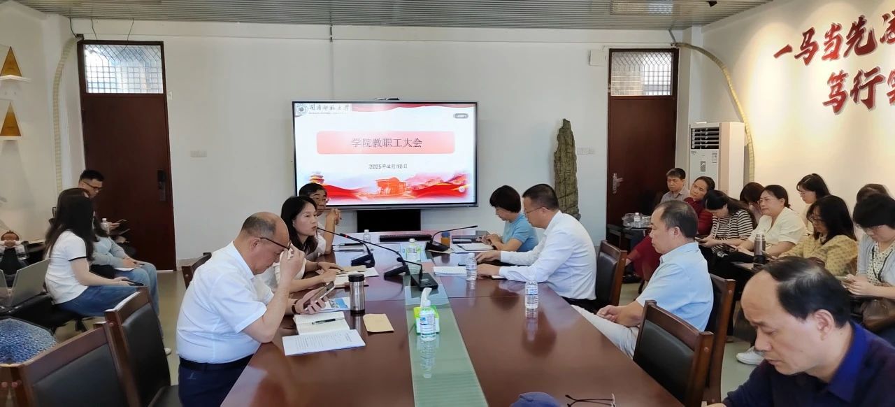 4月10日下午,我院召开教职工大会,我院党委书记方琼主持会议。院长陈再生就思政课教师队伍建设、学生毕业论文、学生就业等工作进行了部署,党委副书记邓战军和全体教职工一起学习贯彻习近平总书记关于宗教和统一战线工作的重要论述,副院长黄耀明、林海燕分别就国家社科申报情况、科研经费使用规范性、期中教学检查、教学展示等工作情况进行了传达与部署。(通讯员 施颖)